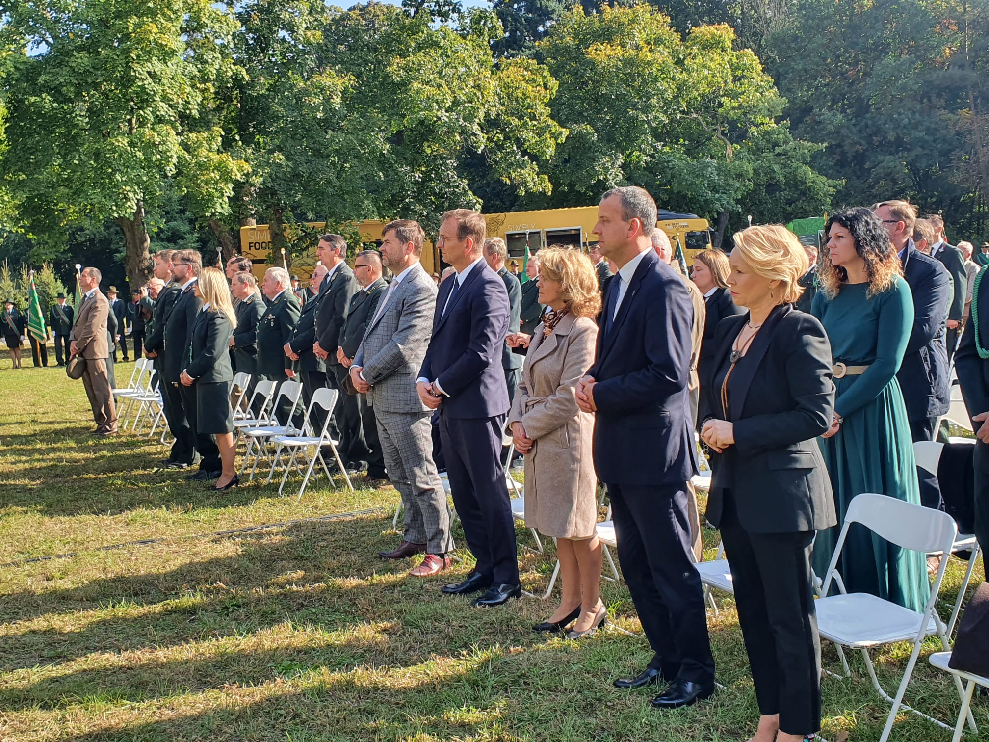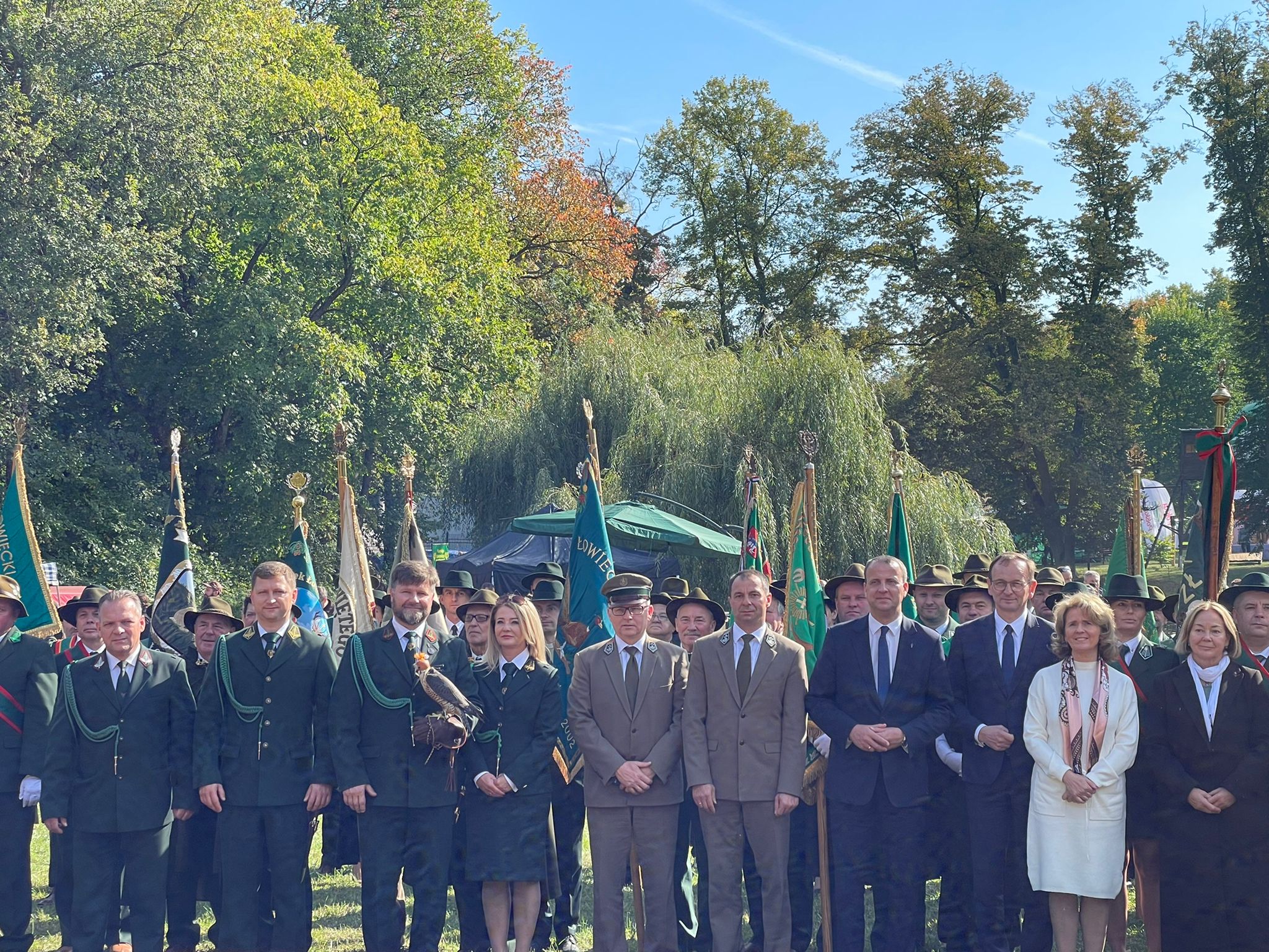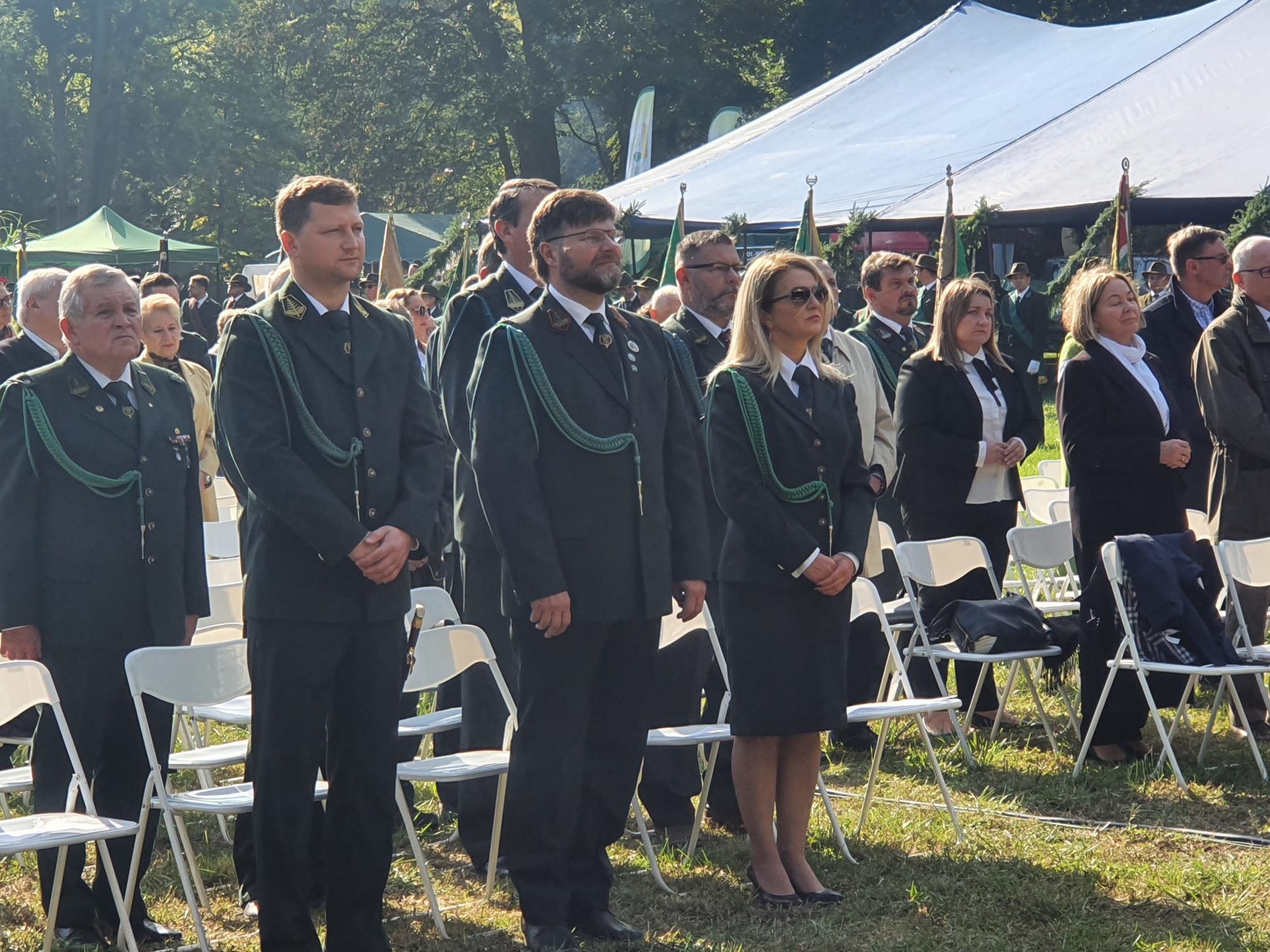 Następnie Orkiestra RK Wojska Polskiego wykonała hymn państwowy. Na zakończenie uczestnicy uczcili minutą ciszy śp. prof. Jana Szyszko. W dalszym ciągu uroczystości poczty sztandarowe przemaszerowały pod pomnik właściciela posiadłości w Tarcach majora Zbigniewa hrabiego Ostroroga-Gorzeńskiego. Paweł Lisiak oraz członkowie Zarządu Głównego PZŁ Ewa Kraska i Damian Przestacki złożyli pod pomnikiem wieniec. Hrabia Ostroróg-Gorzeński był dowódcą jarocińskich powstańców wielkopolskich, myśliwym i organizatorem jednych z największych polowań przed I wojną światową w Wielkim Księstwie Poznańskim. Pasję do polowań odziedziczył po swoim ojcu Stanisławie, budowniczym neorenesansowego pałacu w Tarcach, gdzie odbywa się tegoroczny Ogólnopolski Hubertus. Po zakończeniu oficjalnych uroczystościach rozpoczął się festiwal.