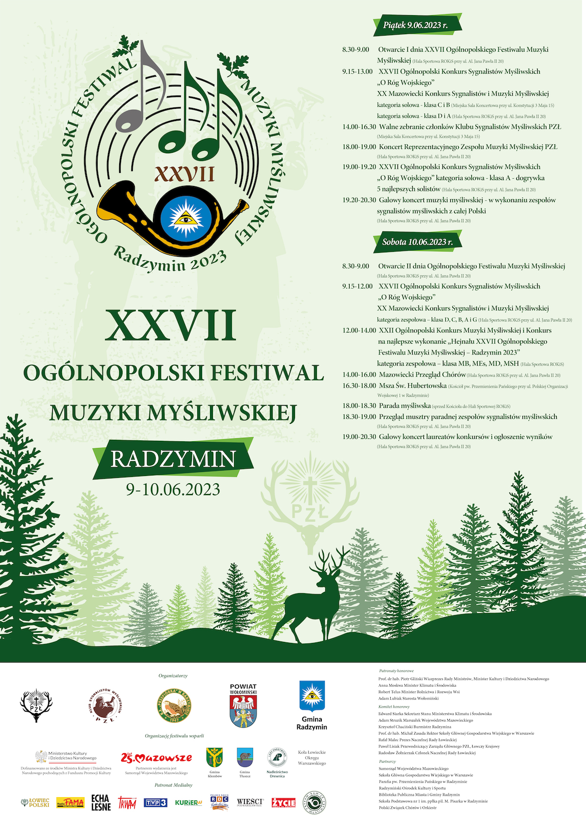 Zapraszamy na XXVII Ogólnopolski Festiwal Muzyki Myśliwskiej, który odbędzie się w dniach 9-10 czerwca 2023 roku w Radzyminie pod Warszawą.